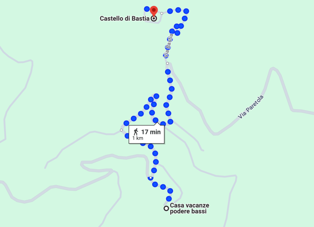 Oppure per gli appassionati di Trutture antiche è possibile recarsi a solo 17 minuti di passeggiata oppure 2 minuti di macchina a visitare il castello di Bastia che dista 1 Km dal podere.
